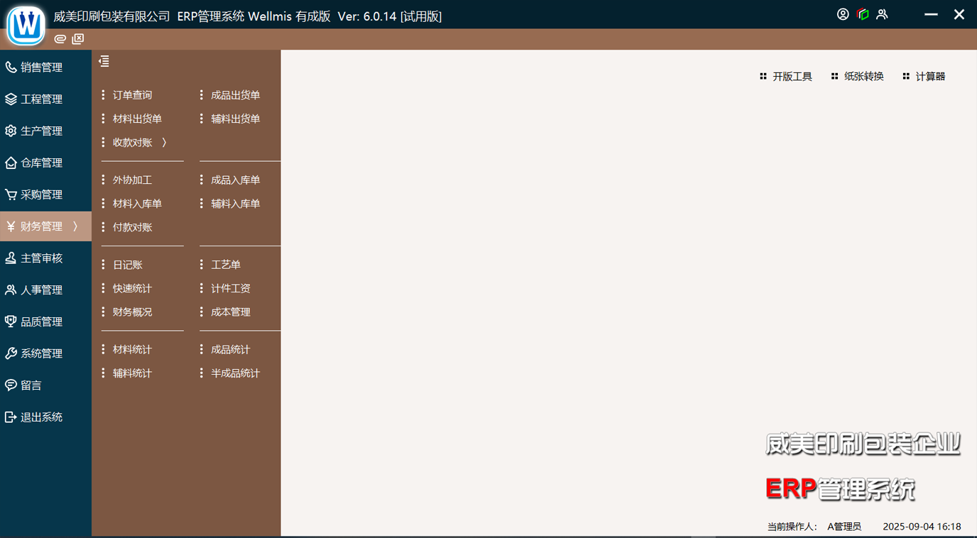● 子模塊包括:訂單查詢,成品入庫單、成品出貨單、材料入庫單、材料出貨單,外協(xié)加工單、日記賬、工藝單查詢、計件工資、成本管理、材料統(tǒng)計等。